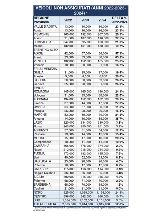 Secondo i dati del Sindacato Nazionale Agenti di Assicurazione (SNA), tra il 2022 e il 2024 il numero di auto senza copertura RC auto è passato da 23mila a 38mila, con un incremento del 65,2%.